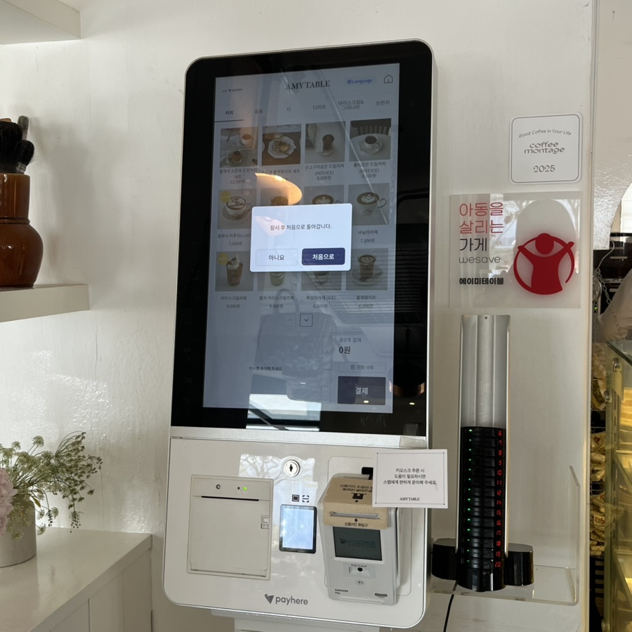 주문은 키오스크로 하면 되고, 진동벨에 적혀있는 번호만 입력하면 돼서 간단했어요. 포장도 똑같이 키오스크로 주문한 후, 직원분한테 전달하면 됩니다. 낮 시간이라 대부분 케이크보다 브런치 즐기시는 분이 많았고, 손님이 많았는데 음식이 빨리 나오는 편이었어요.