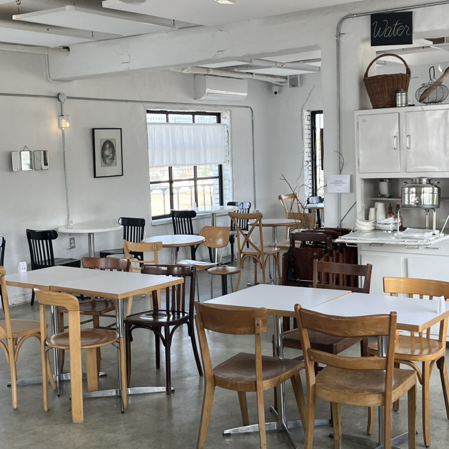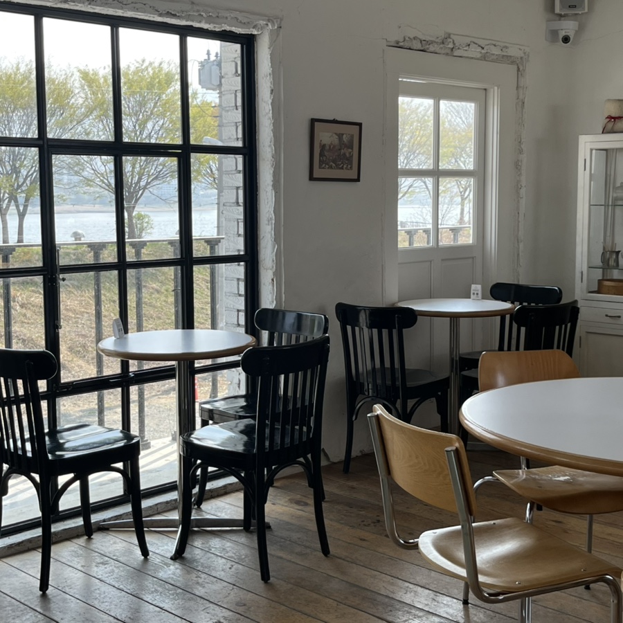2층은 사방에 큰 창이 있어 볕이 잘 들어왔고, 따뜻한 분위기를 느낄 수 있었어요. 좌석수도 꽤 많았는데 남한강 뷰를 볼 수 있는 창가 자리가 인기 많았습니다. 아기의자도 준비되어 있어요.