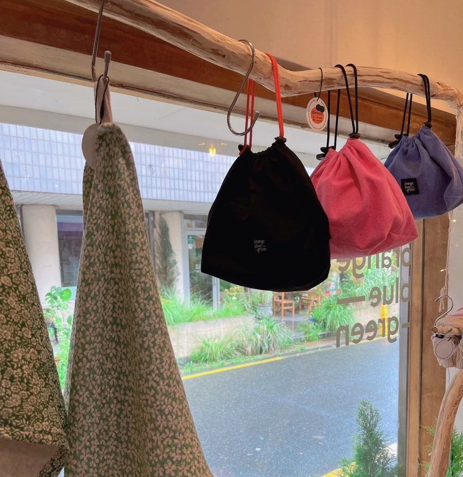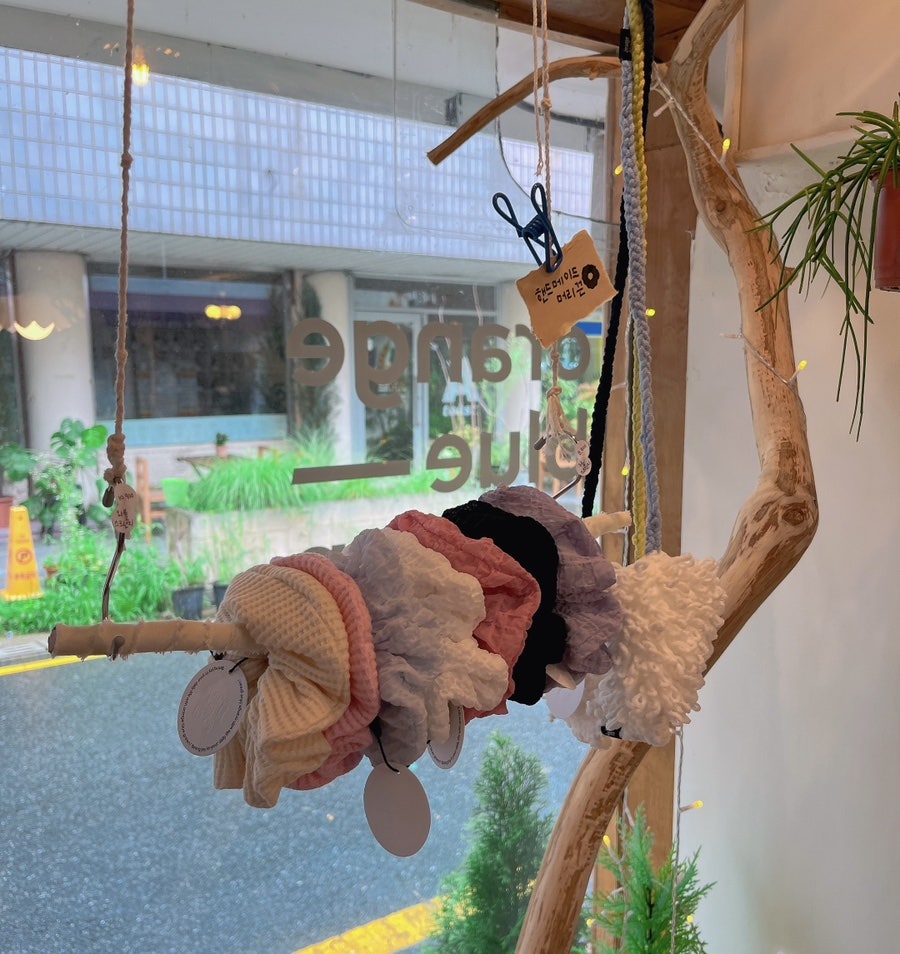 머리끈류는 모두 핸드메이드 제품이었어요. 언니는 구름 스크런치를 샀는데 엄청 쫀쫀해서 오랜 사용 가능하고, 하늘하늘한 색감이 예뻤어요. 파우치 소품은 원하시면 선물 포장도 가능하니 직원분한테 문의하시면 됩니다.
