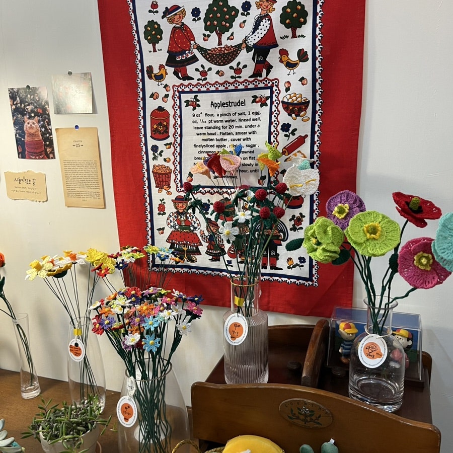 하나하나 직접 뜬 시들지 않는 뜨개 꽃과 죽지 않는 뜨개 화분은 색감이 쨍하니 예뻐서 인테리어 포인트로 사용하기 좋을 것 같았어요. 평소에 시들어가는 꽃을 처리하기 싫어서 꽃 선물을 안 좋아했는데 죽지 않는 꽃이라니 마음에 쏙 들었어요. 이외에도 키링이나 화분 커버 등 정성 가득한 뜨개 소품이 많이 있었습니다.