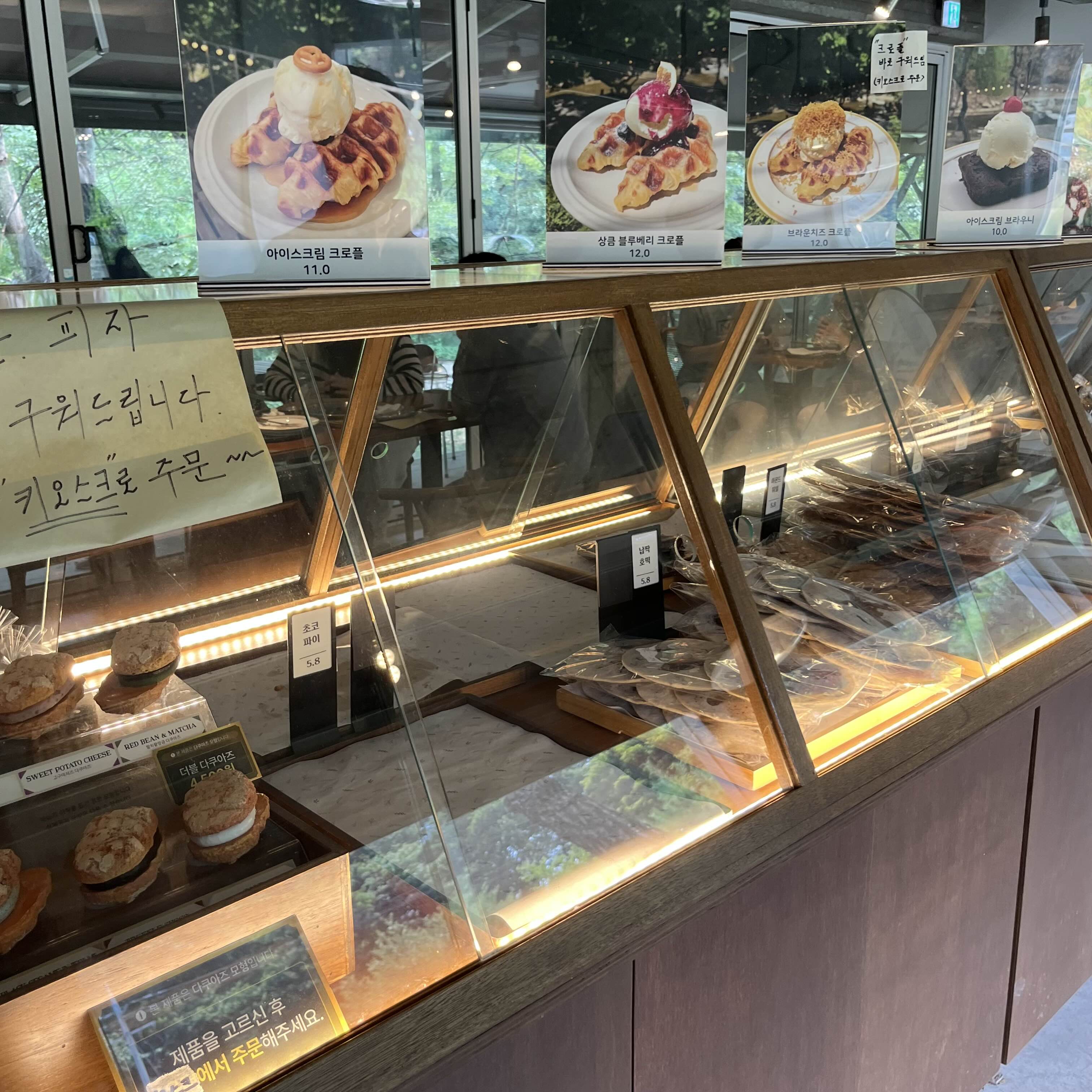 오후에 방문해서 빵은 거의 없었어요. 그래서 피자 먹을까 했는데 또띠아 피자스타일인데 터무니없는 가격이라 크로플 주문해서 먹었어요.