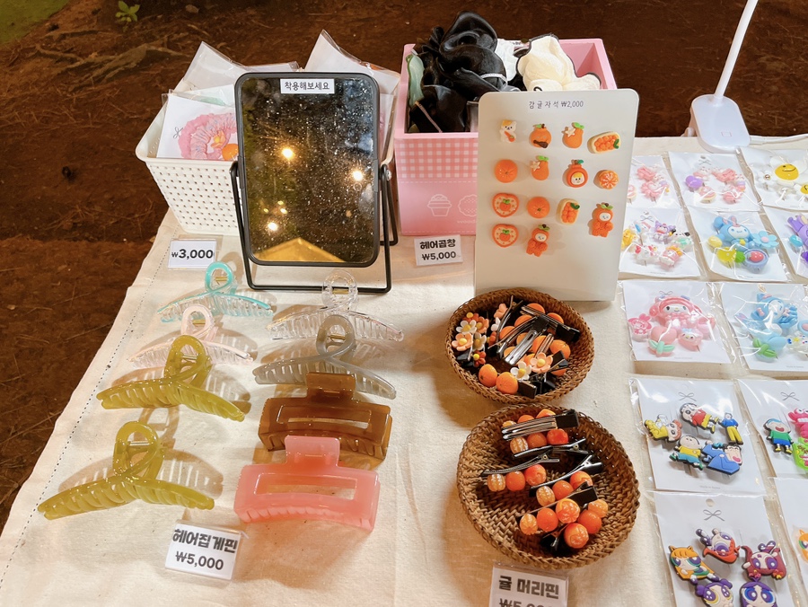 모자, 머리띠, 액세서리, 가방, 애견용품 등을 판매하는 플리마켓이 한쪽에 쭉 자리 잡고 있었고, 제주스러운 굿즈들이 많아 기념품이나 선물용으로 구매하기 좋았습니다.