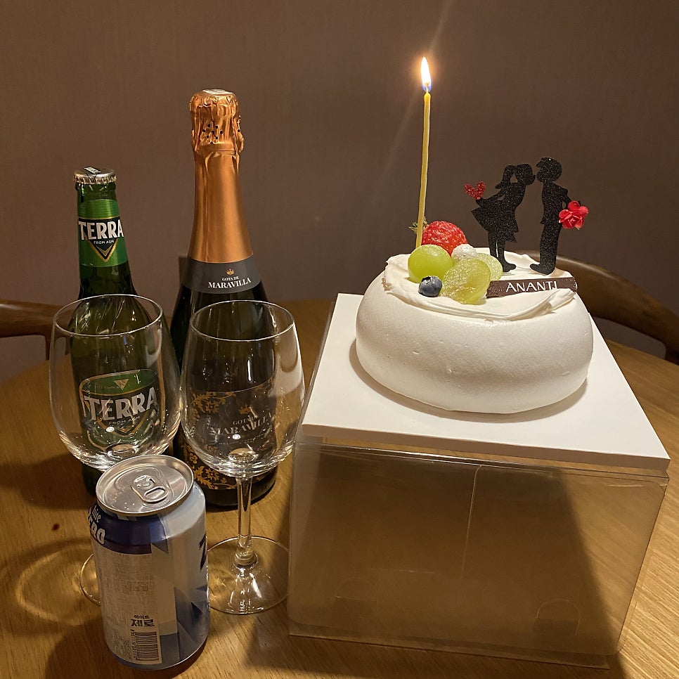 연인 패키지 혜택으로 받은 스몰 케이크와 이터널저니 커플세트 메뉴에 포함된 스파클링 와인 1병.