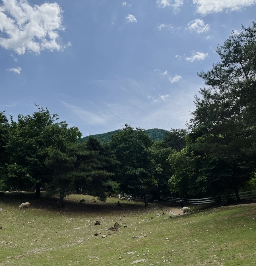 한국의 알프스라는 말이 확 와닿았어요. 여름의 청량함을 단번에 느낄 수 있었고, 뻥 뚫린 풍경을 바라보기만 해도 힐링이 됐고, 기분이 좋아졌어요. 방목장으로 올라가면 자유롭게 방목된 양을 보실 수 있습니다. 양들이 사람을 자주 봐서 그런지 가까이 다가가도 겁내지 않았어요.