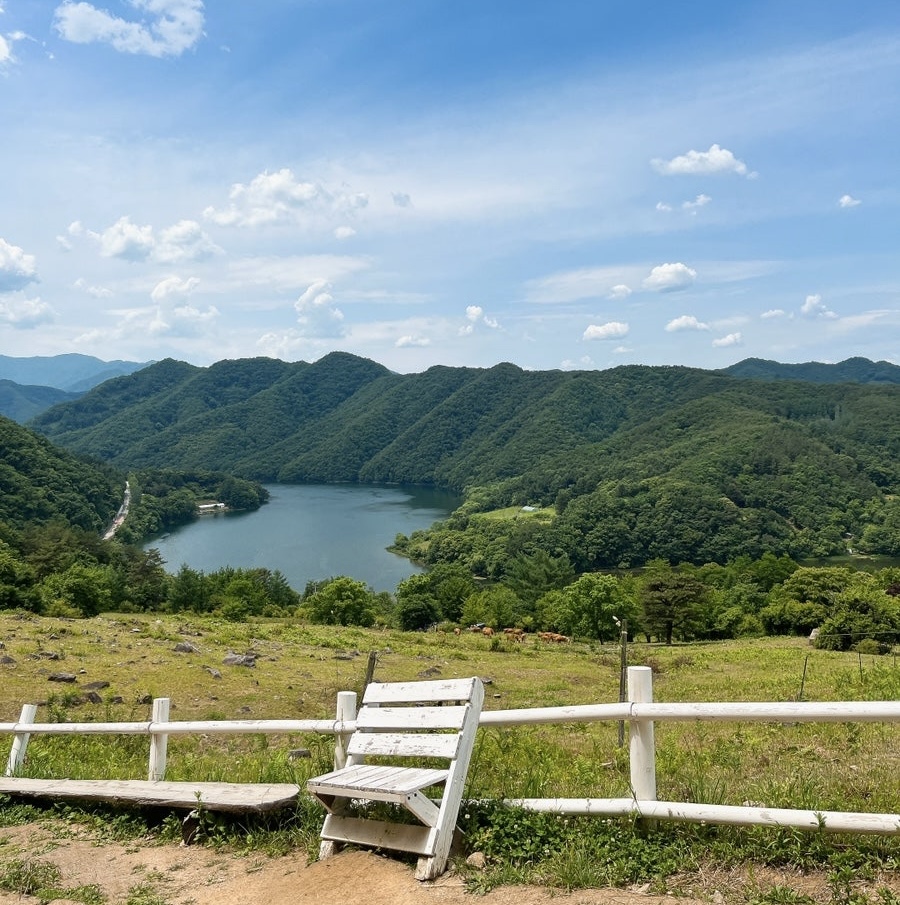해피초원목장을 방문한 목적이 바로 춘천호를 배경으로 찍을 수 있는 포토존이었어요. 그림 같은 풍경을 배경으로 멋진 인생 샷을 남길 수 있었습니다.