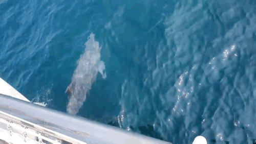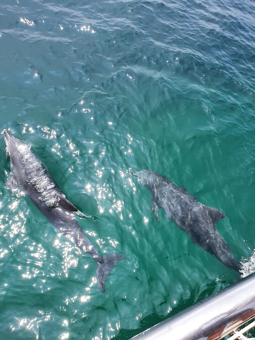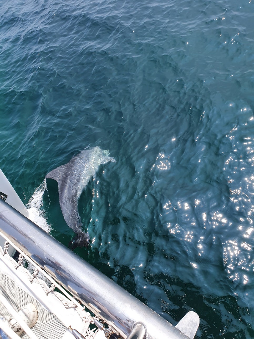 요트탄지 몇 분 안 돼서 돌고래가 보인다는 말을 듣고 봤더니 지느러미가 보이기 시작했어요. 한 마리도 아니고 여러 마리가..!