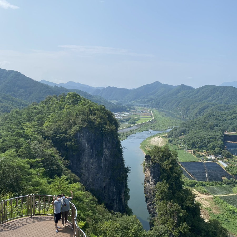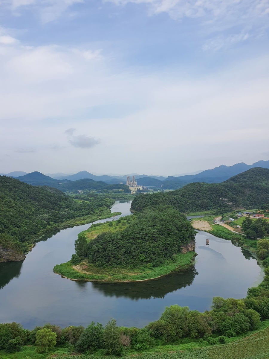 전망대로 올라가시면 완벽한 한반도 지형을 보실 수 있답니다. 맑은 강물과 뗏목 그리고 푸릇한 한반도 지형과 주변 나무들이 마치 그림 같았고, 아름다웠어요.